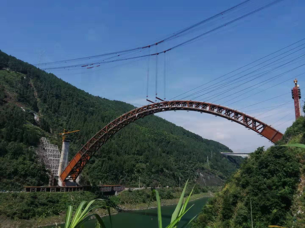 該橋?yàn)榉菍?duì)稱(chēng)上承式鋼管混凝土拱橋,主跨292米,在同類(lèi)型橋梁中居世界第一,采用跨度865米的2×150噸纜索起重機(jī),在國(guó)內(nèi)首次實(shí)施兩片拱肋同時(shí)整節(jié)段吊裝,主拱于2019年7月31日合攏。
