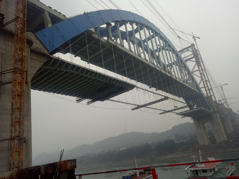 該橋?yàn)閲?guó)內(nèi)跨徑大的中承式公鐵兩用鋼箱拱橋,主跨336米,采用400噸纜索起重機(jī)吊裝施工,主拱于2017年6月合龍,合龍精度4毫米。