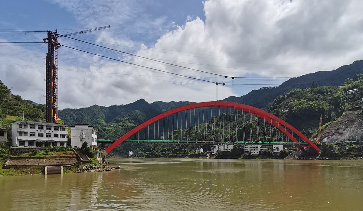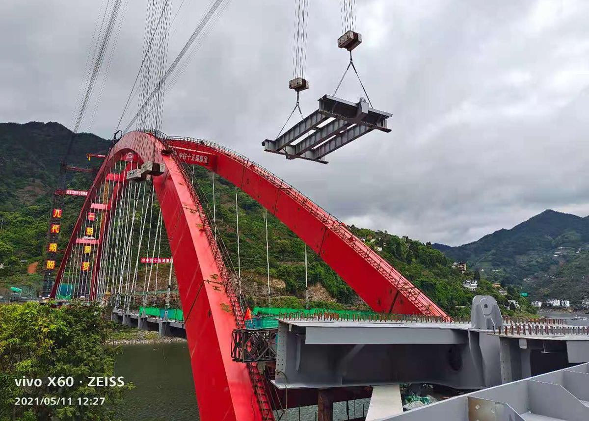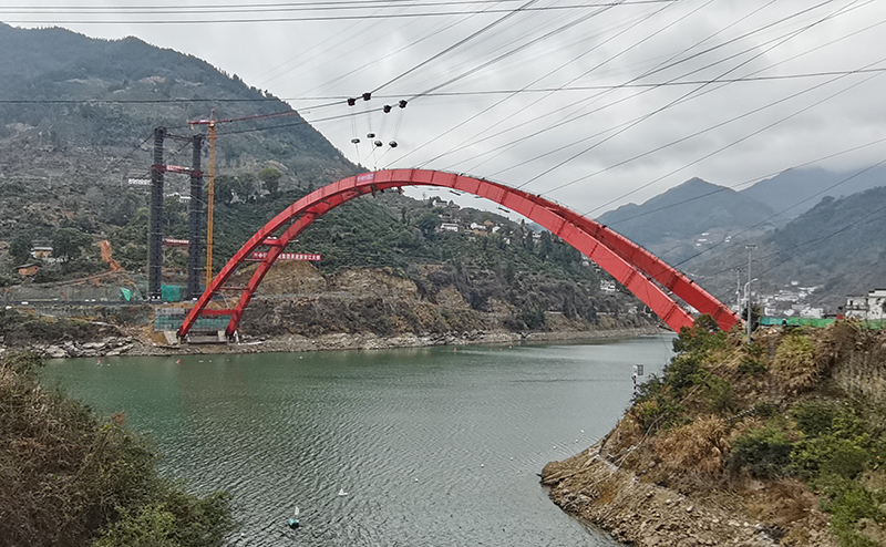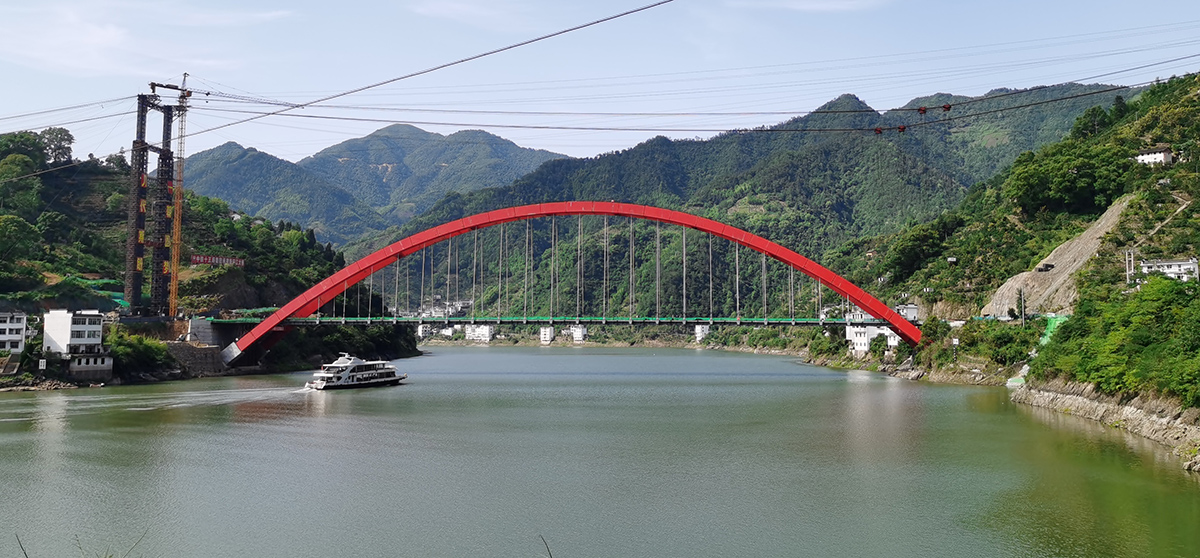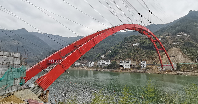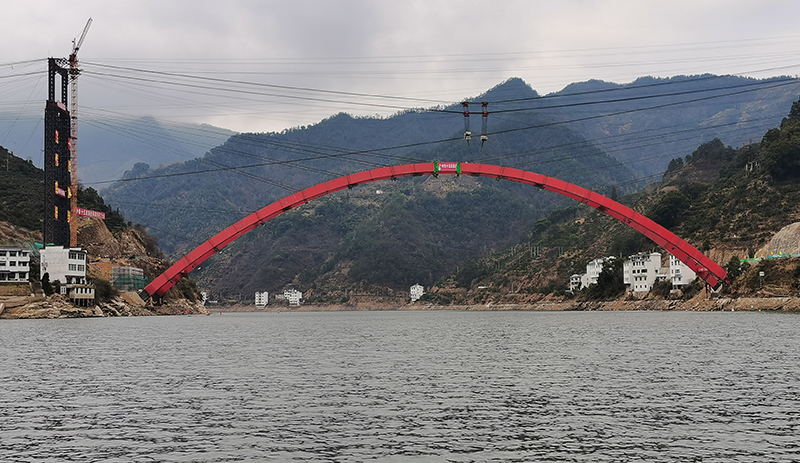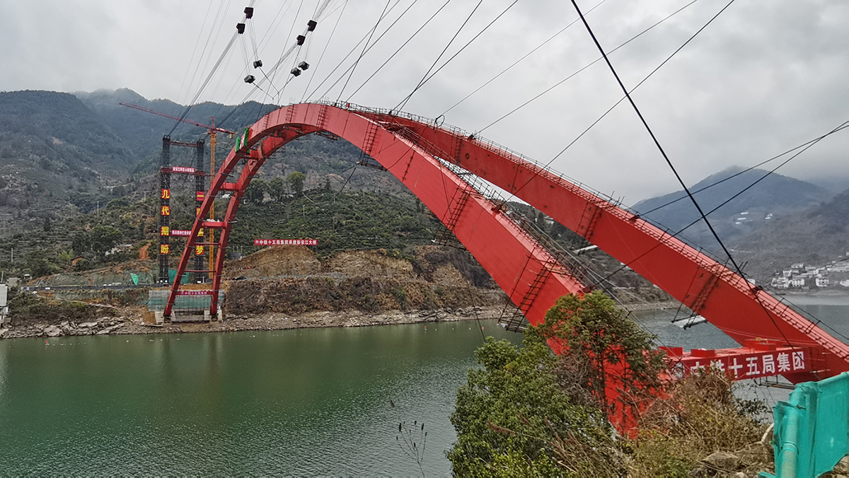 新安江大橋是目前安徽省內(nèi)最大的單栱中承式鋼箱提籃拱橋,大橋位于歙縣街口鎮(zhèn)和新溪口鄉(xiāng)境內(nèi),全長(zhǎng)279米,主跨257.2米,采用180噸纜索吊進(jìn)行安裝,主拱于2021年1月26日合龍。