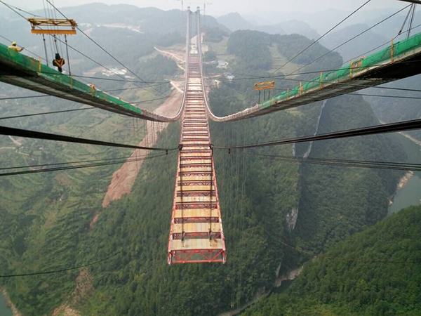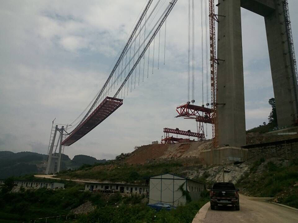 貴州貴甕高速清水河特大橋,主橋2178米,主跨為1130米雙塔單跨鋼桁架加勁梁懸索橋,橋高520米,采用2×100噸纜索起重機(jī)安裝加勁梁,建成后成為亞洲山區(qū)懸索橋和世界第二高橋之稱號。