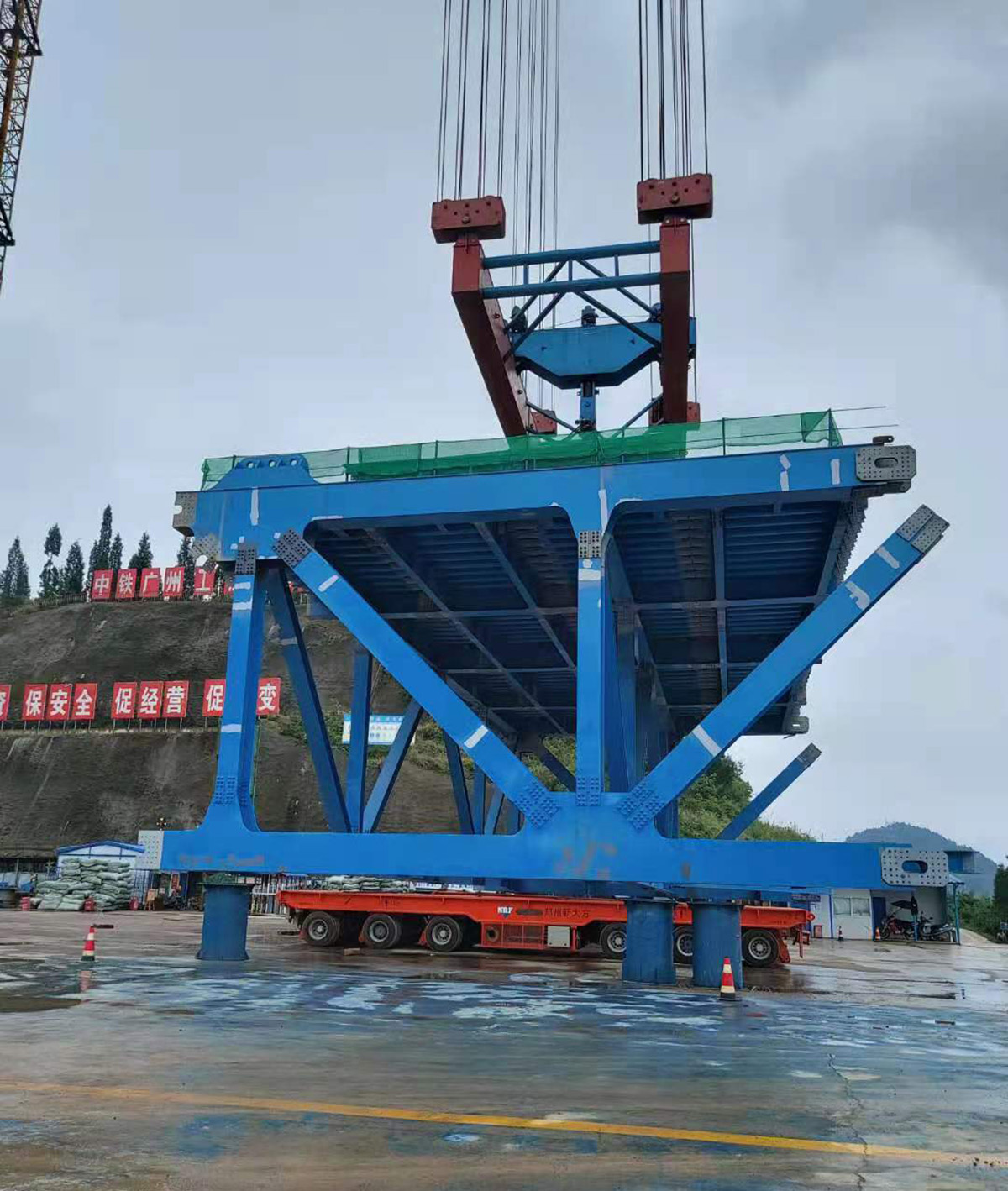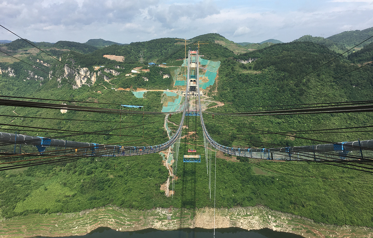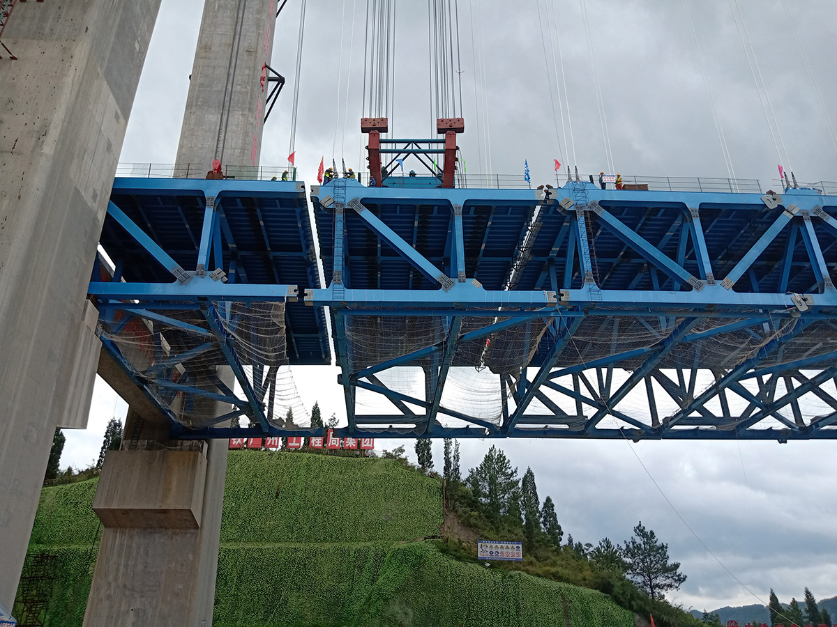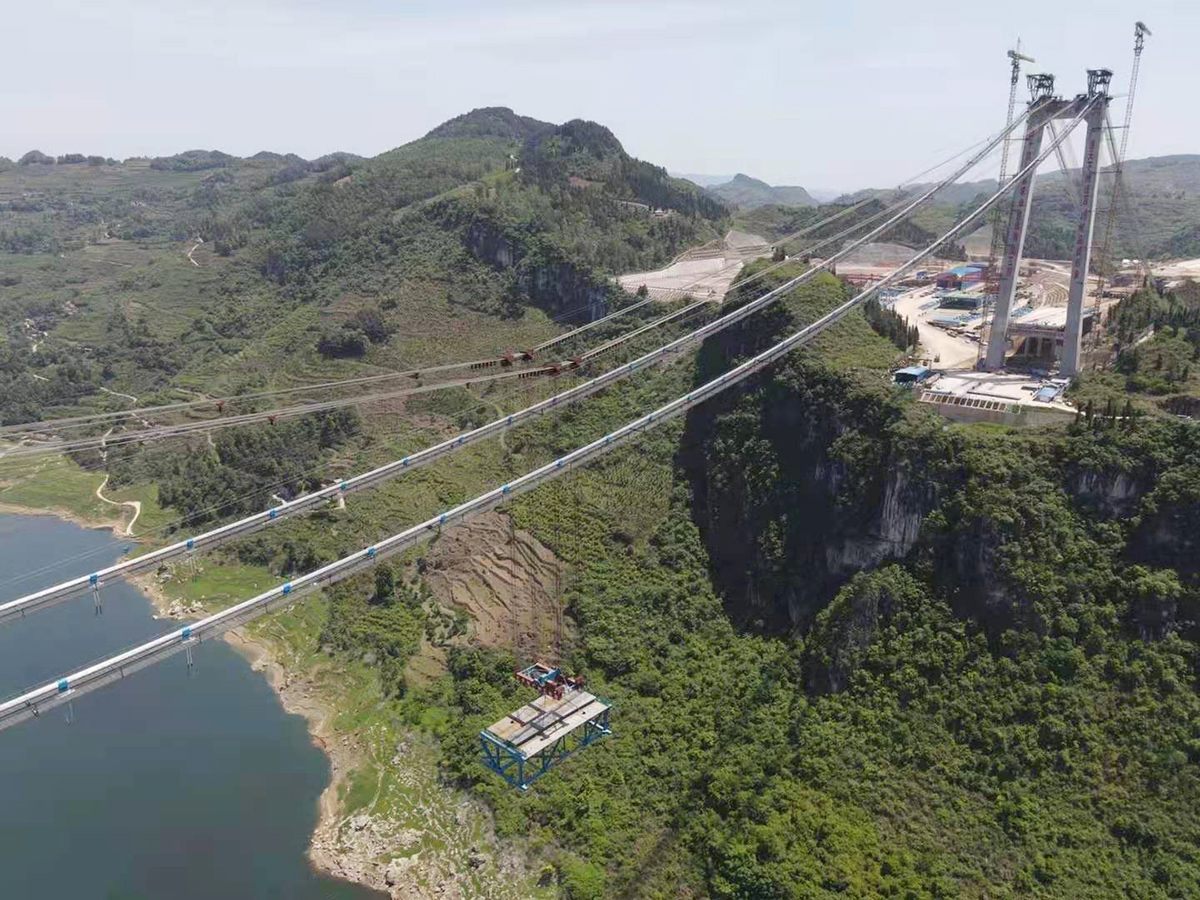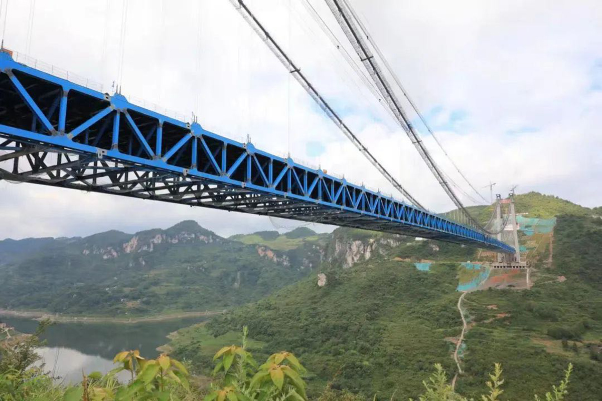 甕開(kāi)高速開(kāi)州湖特大橋,為主跨1100米的雙塔單跨鋼桁梁懸索橋,全長(zhǎng)1257米,主塔高139米。采用2×125噸纜索吊進(jìn)行安裝,于2021年8月17日合龍。