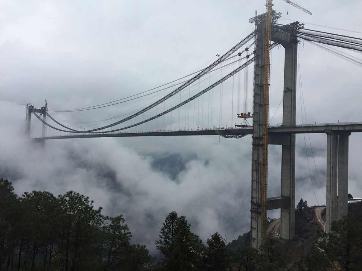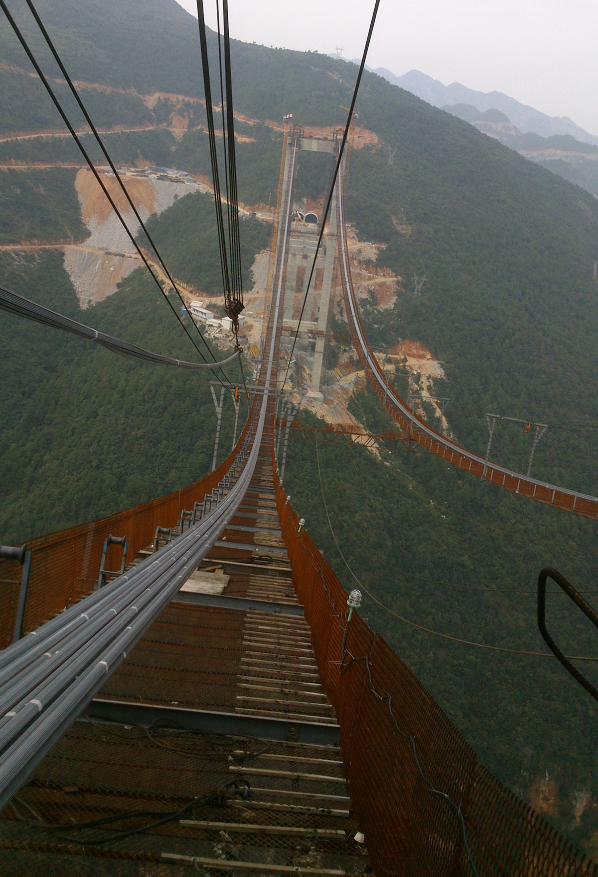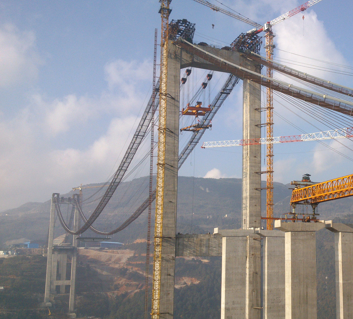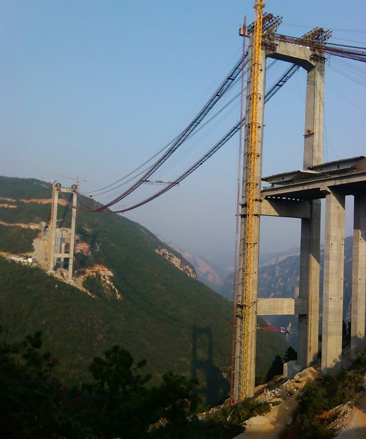 普宣高速普立特大橋,橋長1290米,主橋628米,為雙塔單跨鋼箱梁懸索橋。該橋采用250噸纜索起重機進行鋼梁架設(shè),并首次應(yīng)用公司研發(fā)的旋轉(zhuǎn)吊鉤對構(gòu)件空中姿態(tài)進行自由調(diào)整,為山區(qū)懸索橋開辟了新的鋼梁架設(shè)方法。