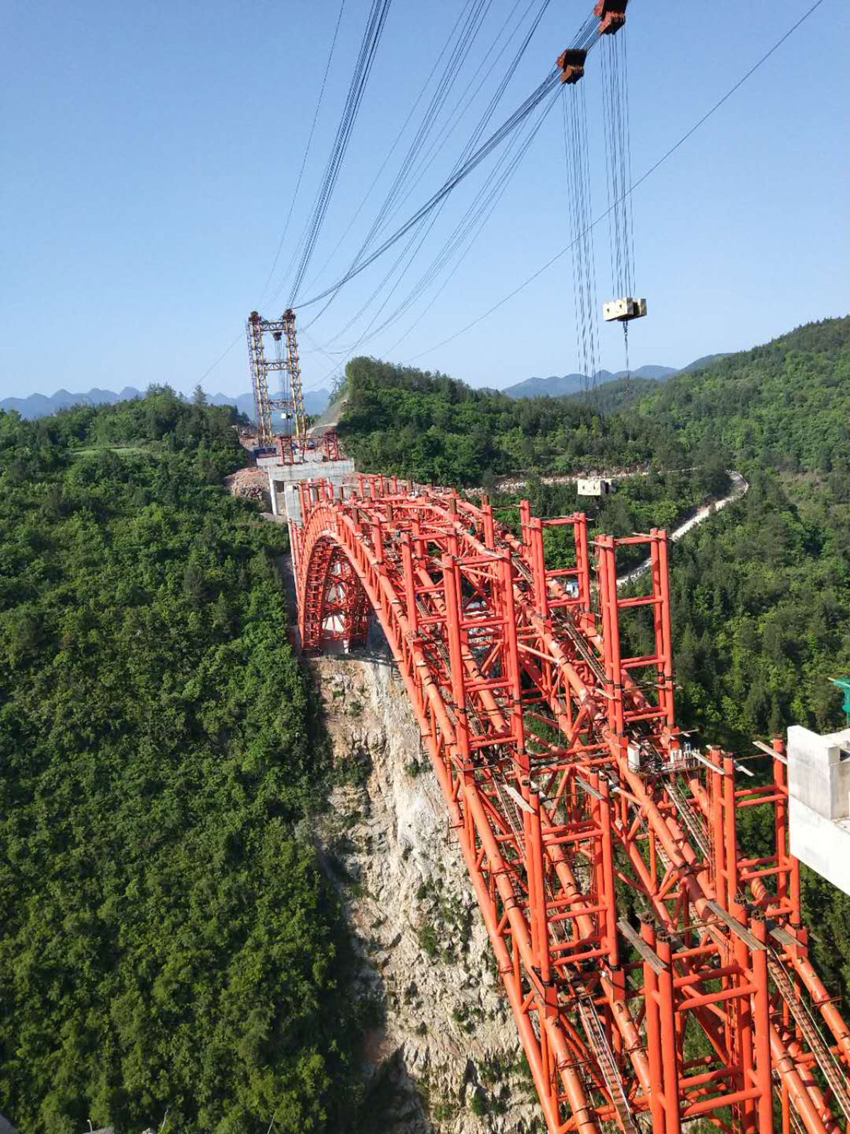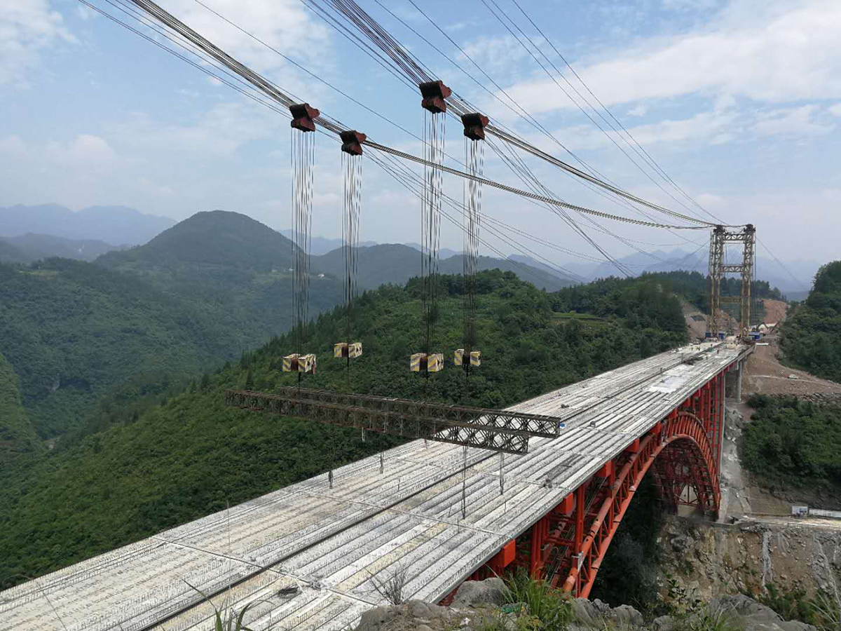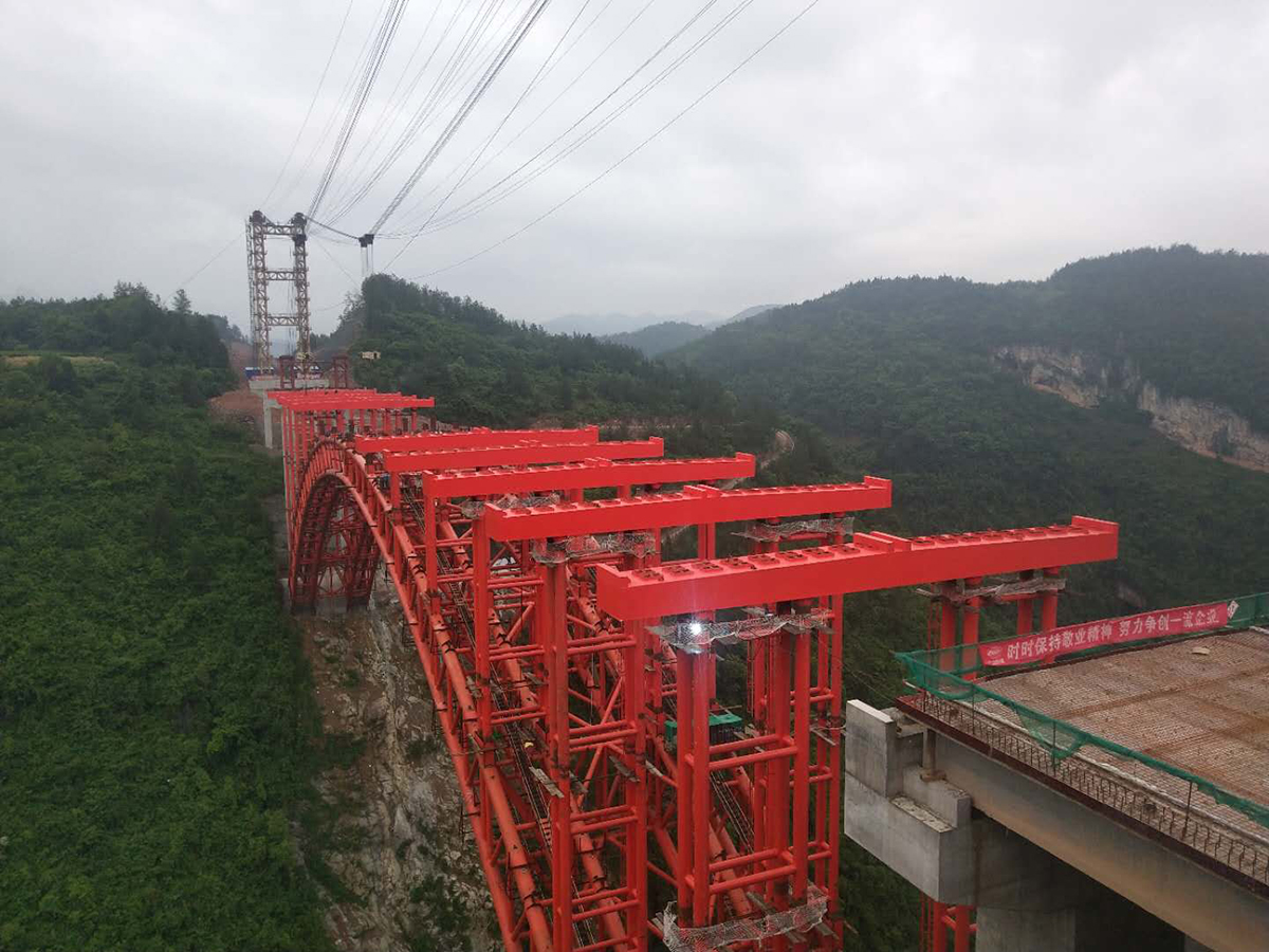 該橋?yàn)樯铣惺戒摴芑炷凉皹颍骺?25米,采用2×50t纜索起重機(jī)安裝,主拱于2018年10月28日合龍。