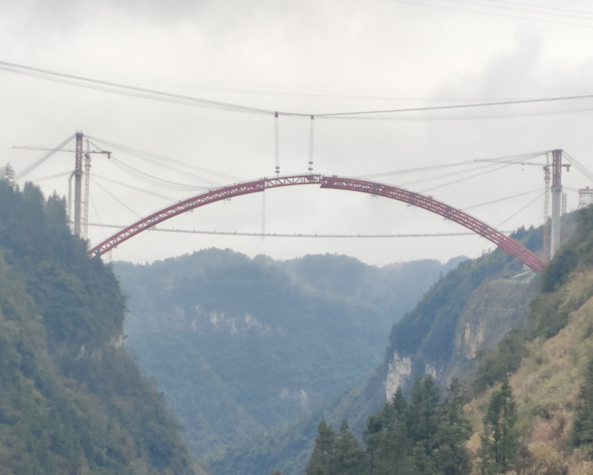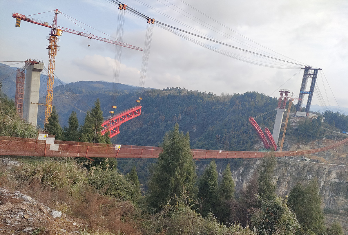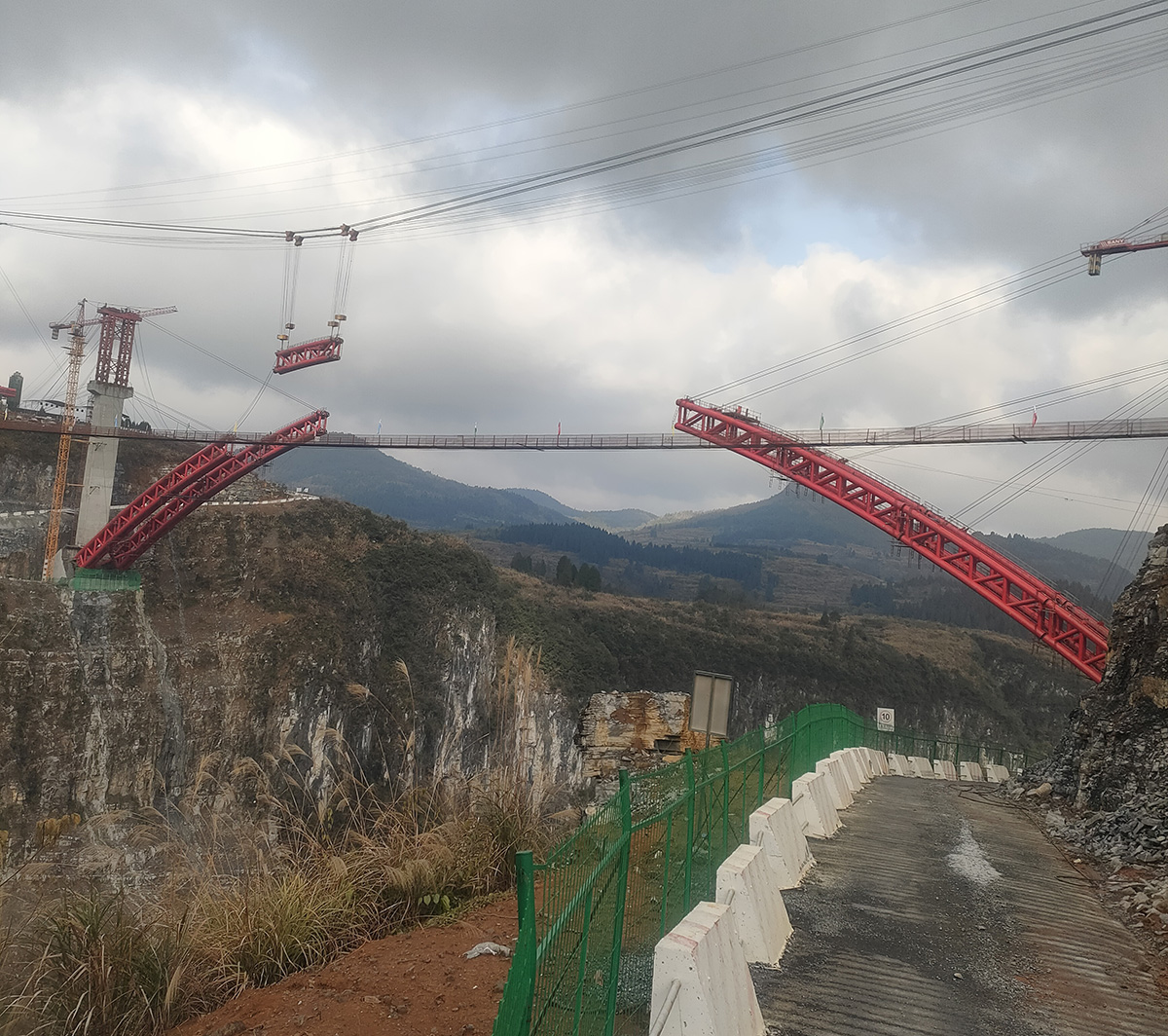 該橋?yàn)橹骺?52米的上承式鋼管混凝土拱橋,全長(zhǎng)412米,是湖南省S253保靖遷陵至夯沙公路控制性工程,采用2×55t纜索式起重機(jī)進(jìn)行安裝,2024年1月25日合龍。